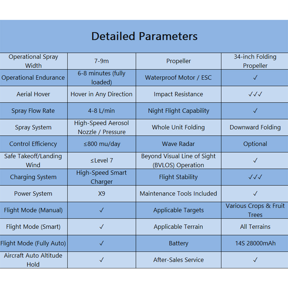 The MX6-30 Crop Protection UAV is engineered for efficient and reliable agricultural operations. It features fully autonomous operation with intelligent route planning, enabling precise and hands-free spraying during both day and night missions. Built for exceptional durability, the airframe incorporates 50-layer thickened carbon fiber arms and offers superior impact resistance, supporting a 30kg payload with a 65kg maximum takeoff weight. Its innovative downward-folding design ensures compact and convenient transport. Powered by a robust 14S 28000mAh high-voltage battery, the UAV provides extended endurance. The spraying system covers a 5-7 meter swath width and is completely waterproof. An optional high-performance aerosol nozzle delivers an 8L/min flow rate with excellent atomization. The package includes a 5.5-inch high-brightness remote controller, and the UAV is equipped with a high-pressure brushless pump, fully waterproof ESC, and a modular structure for easy maintenance, making it an ideal solution for a wide range of crops and terrains.