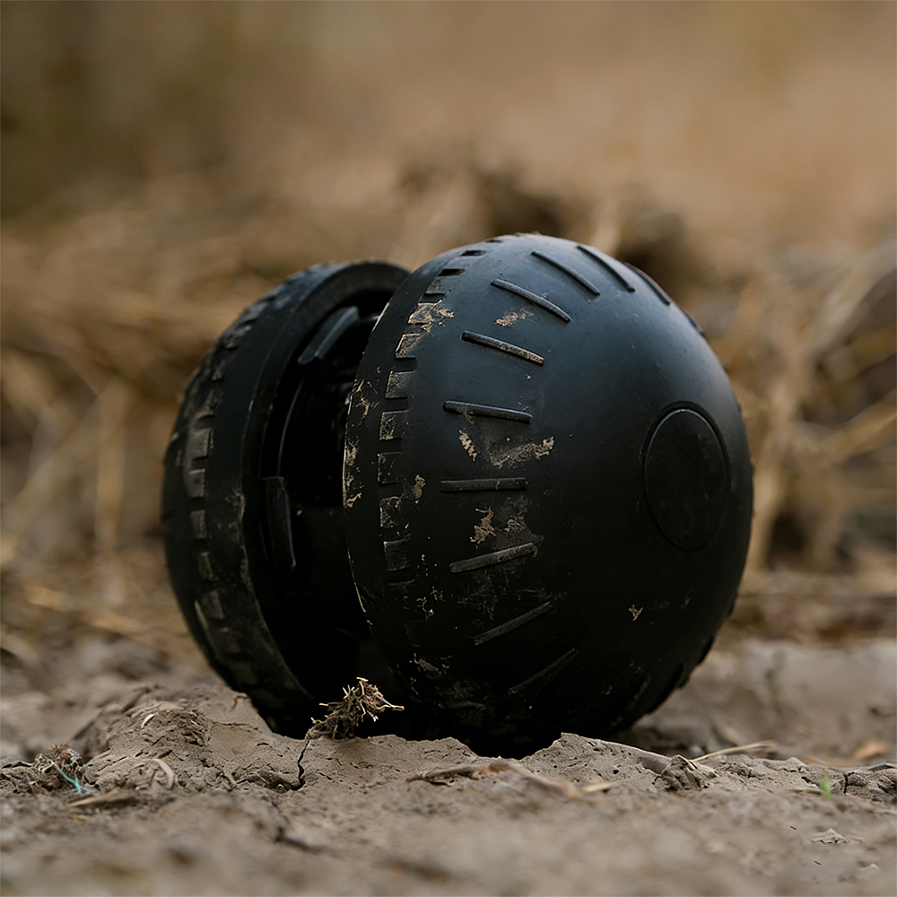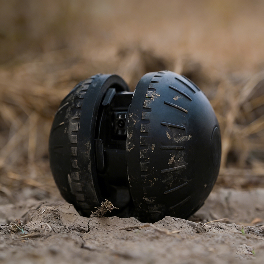 AI Elf · Spherical Robot is primarily designed for the audio-visual information transmission within confined, sealed, or hazardous suspicious spaces. It is rapidly deployed by hand-throwing and, upon landing, transforms from a spherical structure into a wheeled mobility structure.