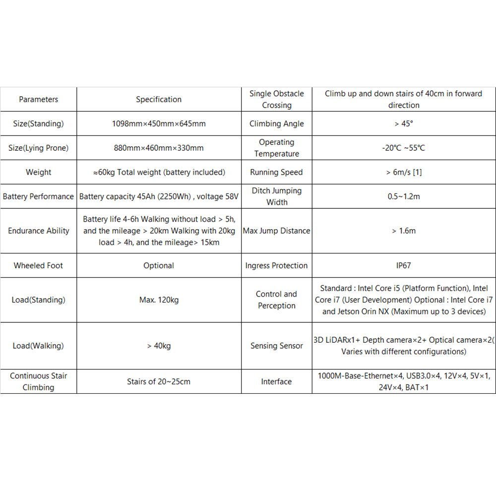 continuous walking with 20kg load can last for greater than 4 hours with over 15km mileage.