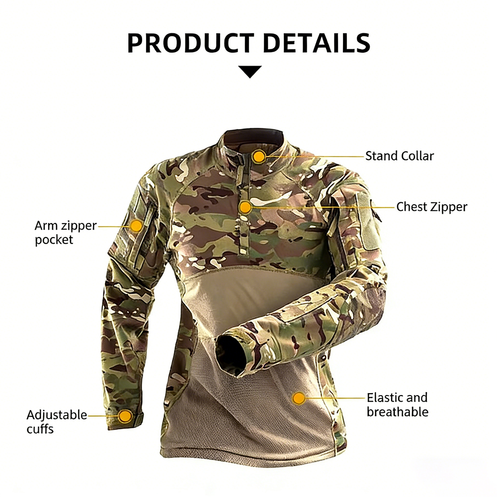 This breathable frog suit tactical shirt is crafted with stretchable, moisture-wicking fabric for enhanced comfort and mobility in demanding environments. Designed with functional camouflage patterning, it ensures effective concealment during outdoor activities such as field training, hunting, and tactical exercises. Combining durability with ergonomic tailoring, it provides reliable performance for men in high-intensity scenarios.