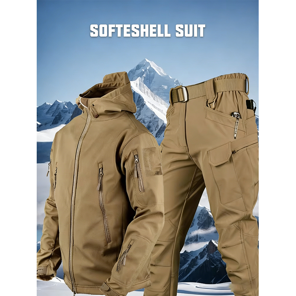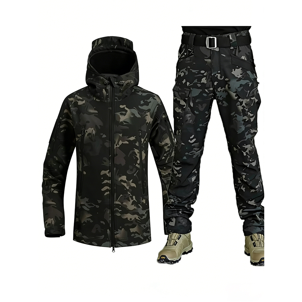 This camouflage tactical jacket combines a soft shell windproof design with a functional hood, tailored for hiking and outdoor operations. Made from durable, stretchable fabric, it offers weather resistance, breathability, and effective concealment in natural environments. With multiple pockets and adjustable elements, it supports versatility and comfort during extended field use.