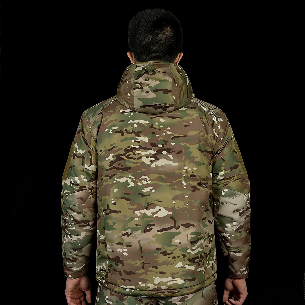 This cold-proof camouflage cotton suit includes a warm jacket with a hood, designed for winter outdoor use. Made from durable cotton blend fabric, it offers waterproof protection while retaining breathable warmth in harsh conditions. Ideal for hunting, tactical training, and field activities, it combines comfort and functionality for all-day wear in low-temperature environments.