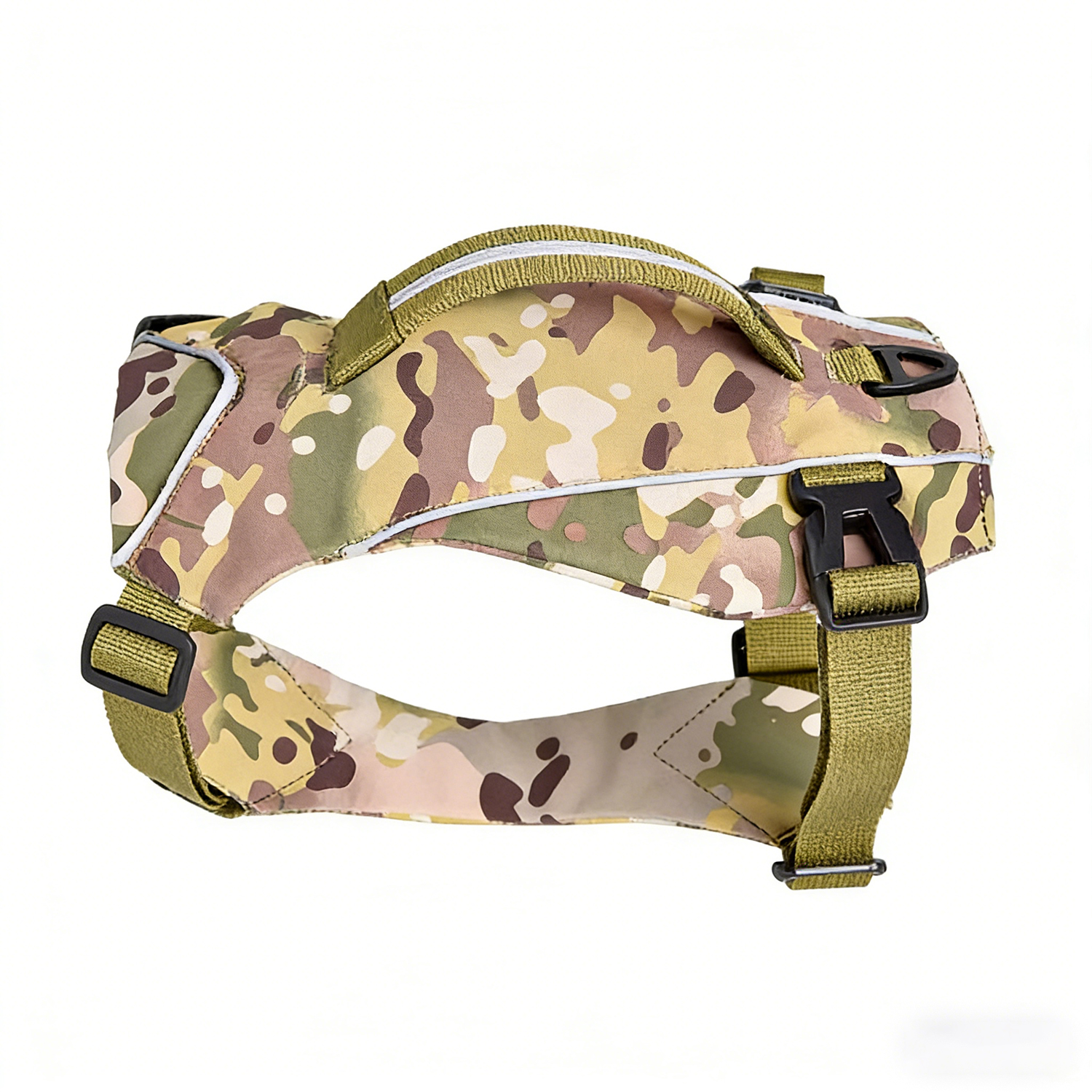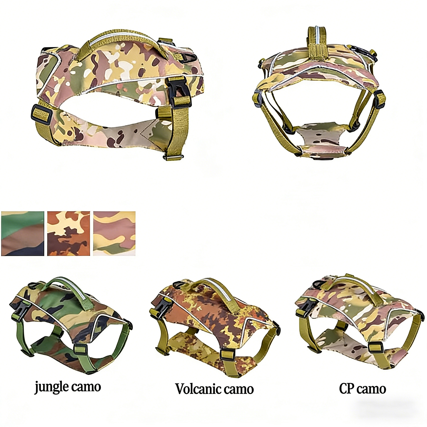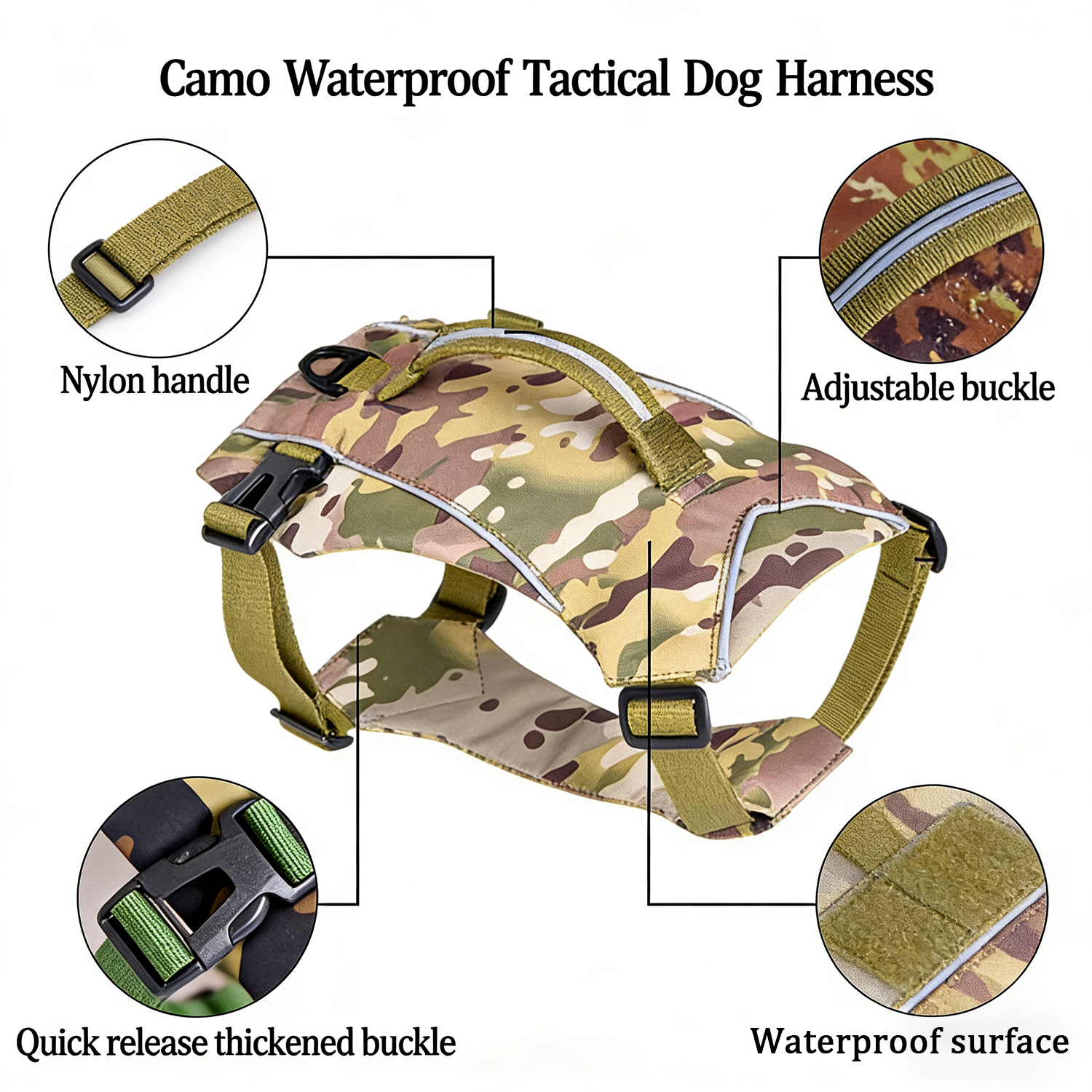 This heavy-duty dog harness features a waterproof tactical camo vest with adjustable fit and quick-release buckles. Built for rugged outdoor use, it offers durable pet protection and secure comfort during demanding activities and varied weather conditions.
