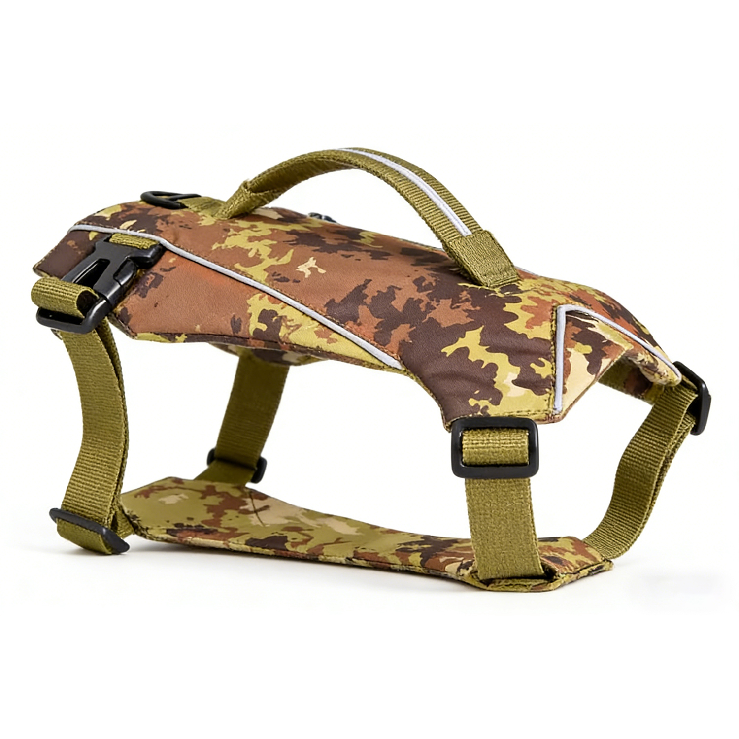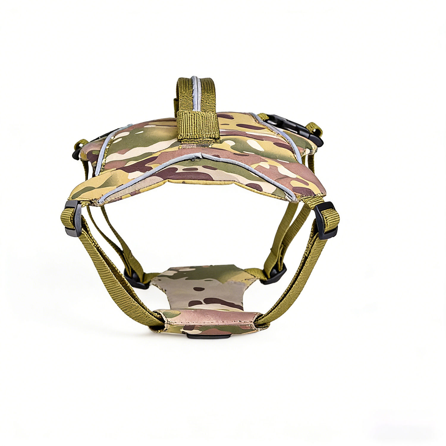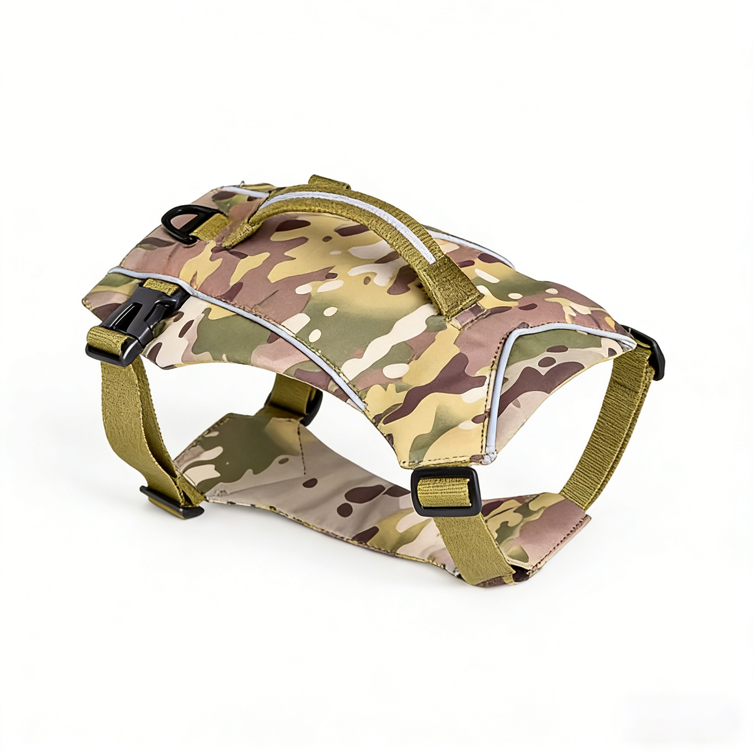 This heavy-duty dog harness features a waterproof tactical camo vest with adjustable fit and quick-release buckles. Built for rugged outdoor use, it offers durable pet protection and secure comfort during demanding activities and varied weather conditions.