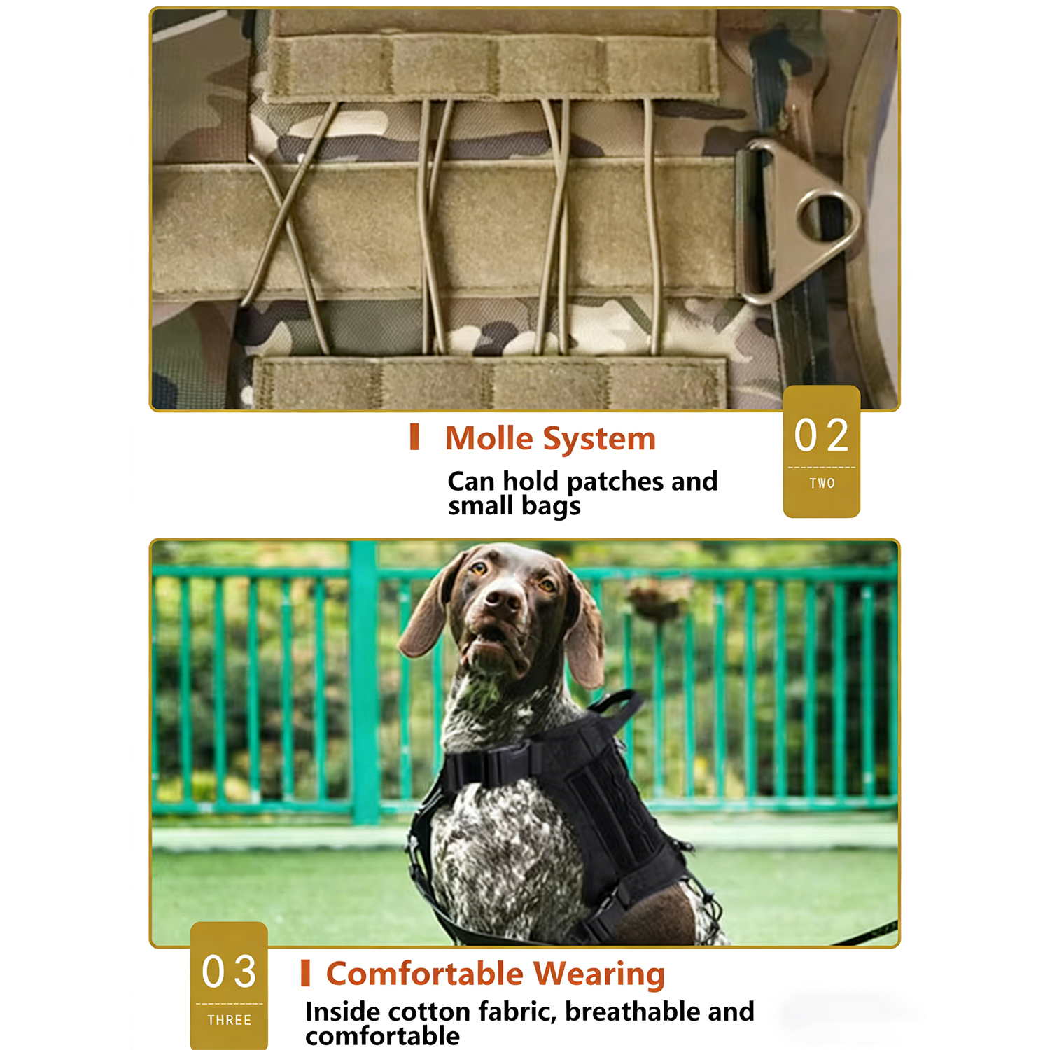 t and back system with camouflage design. Built for outdoor and hunting use, it offers adjustable straps and secure attachments, combining rugged functionality with comfort for active dogs in demanding environments.