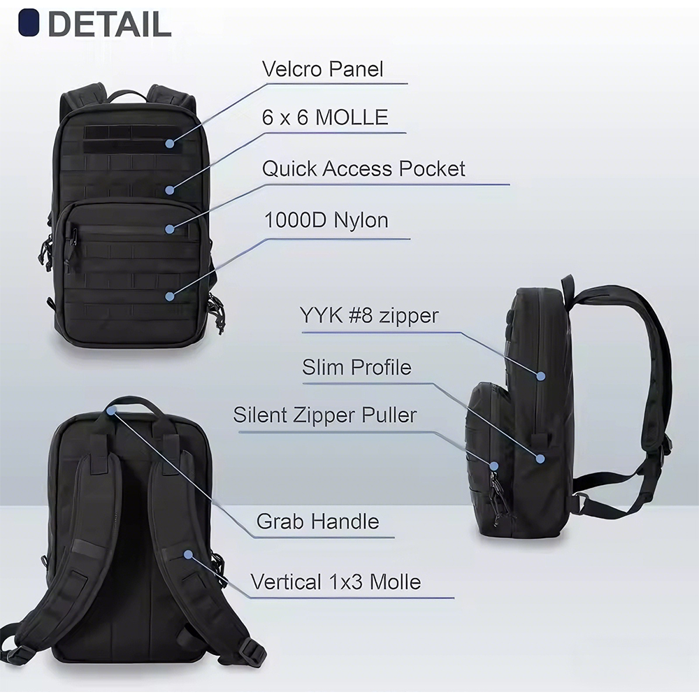 This Portable Mini Daypack Tactical MOLLE Backpack is made of lightweight, durable Polyester and Nylon, designed for tactical, outdoor activities. It features a versatile, splashproof design with anti-theft functionality, adjustable straps, and 14-inch EDC capacity. Certifications include ISO9001, BSCI, and ETX, ensuring compliance with international quality standards, offering reliability and market access.