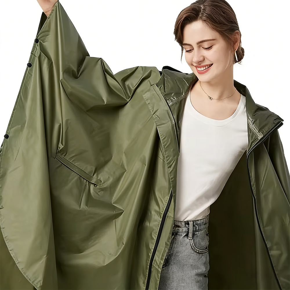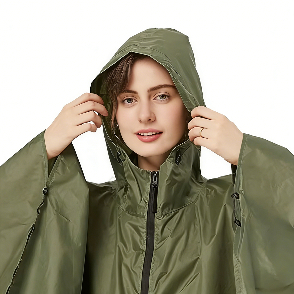 This army-green rain cape is crafted from waterproof impermeable cloth, serving as a versatile combat cloak for hiking, cycling, and hunting. Its tactical poncho design ensures reliable weather protection during outdoor adventures in challenging conditions.