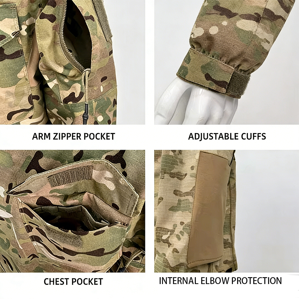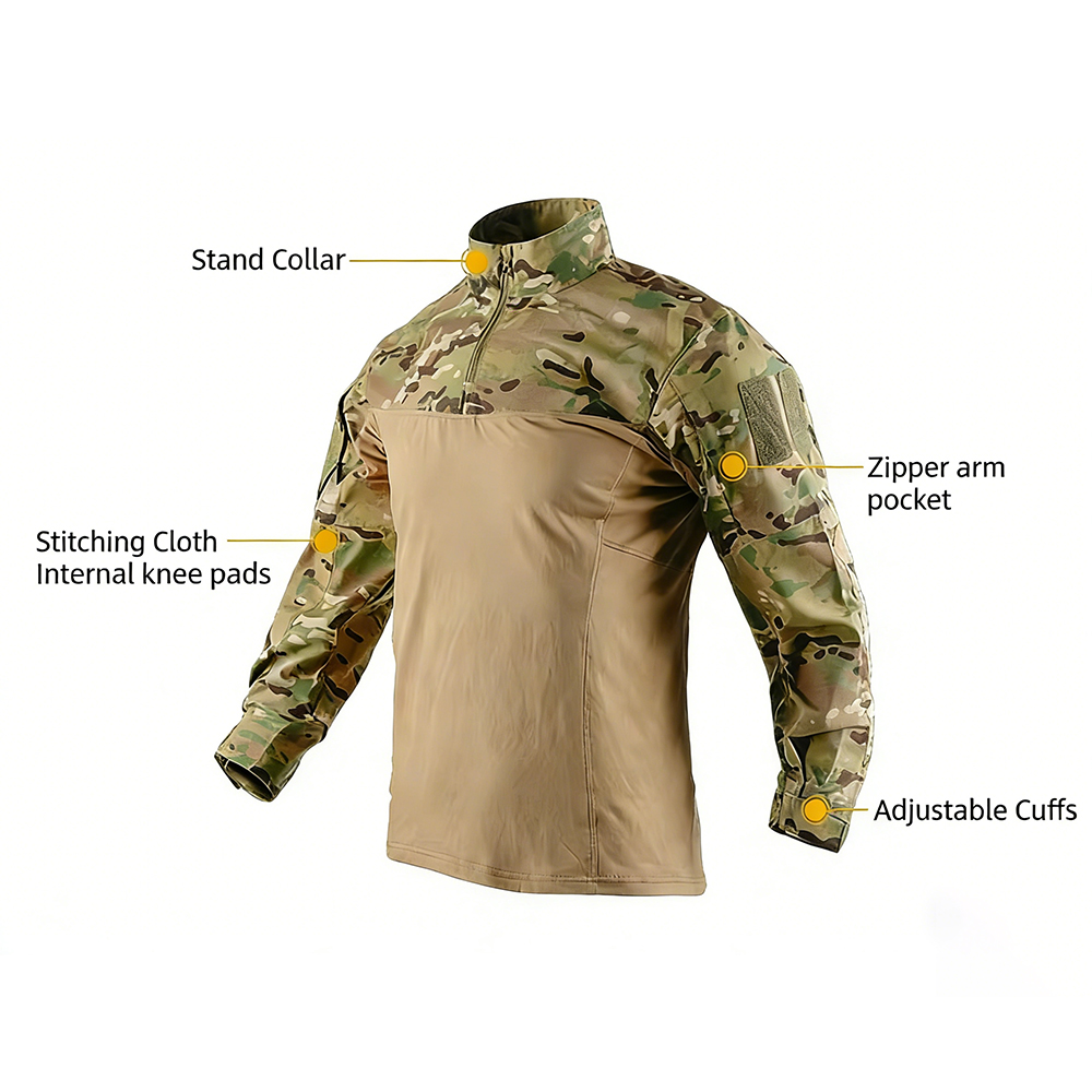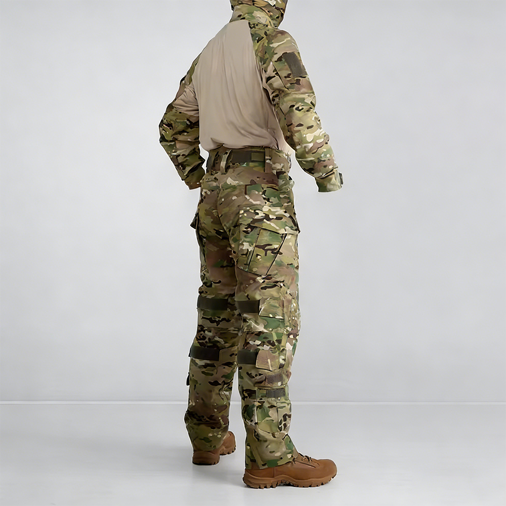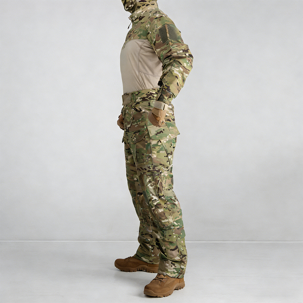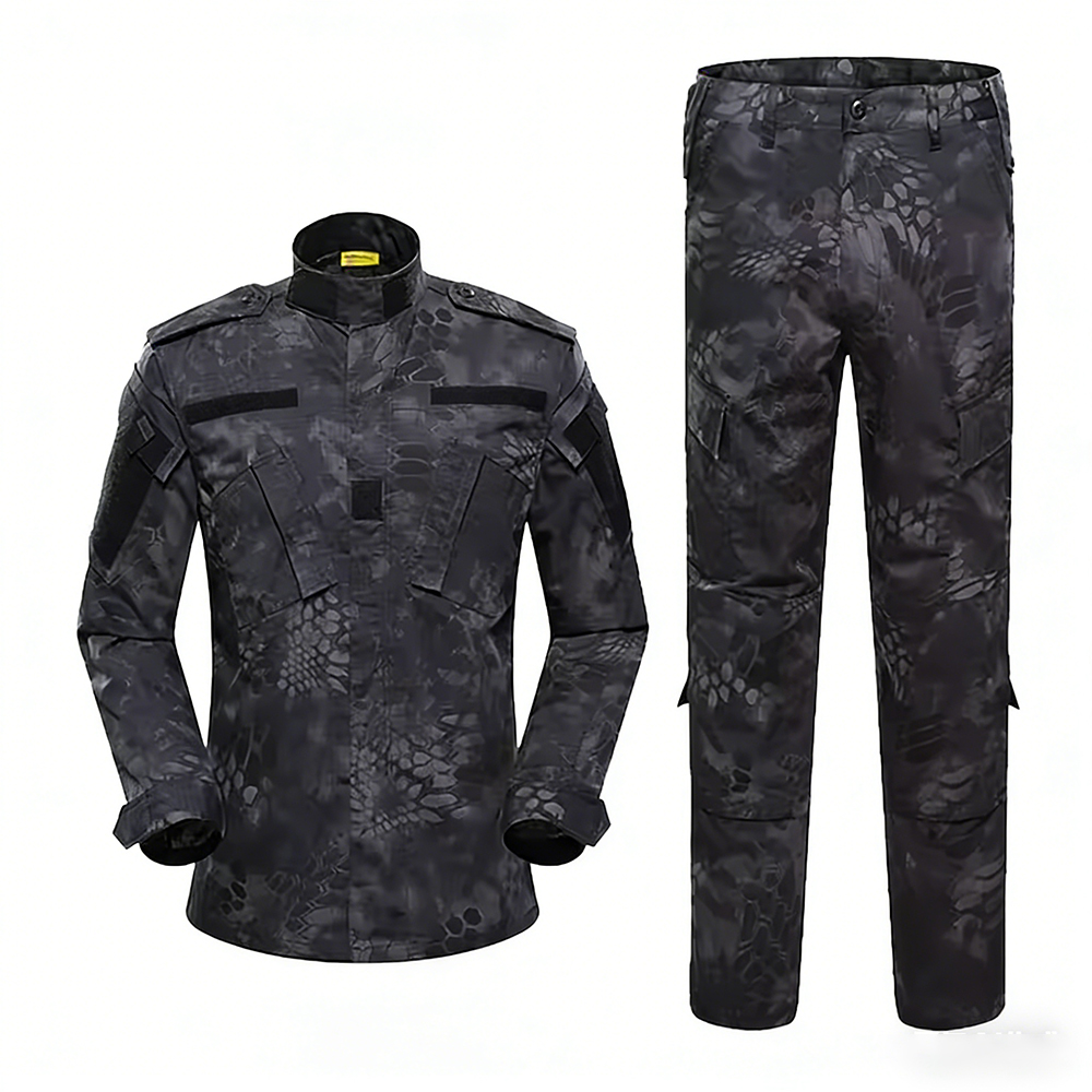 This tactical combat uniform features a Rip Stop Nylon fabric blend with elastic T C 65/35 composition, offering durability and flexibility for high-intensity hunting and field operations. Designed as a matching pants and shirt set, the camouflage pattern ensures effective concealment while maintaining breathability and freedom of movement. With reinforced seams and functional details, it provides reliable performance in demanding combat and outdoor environments.
