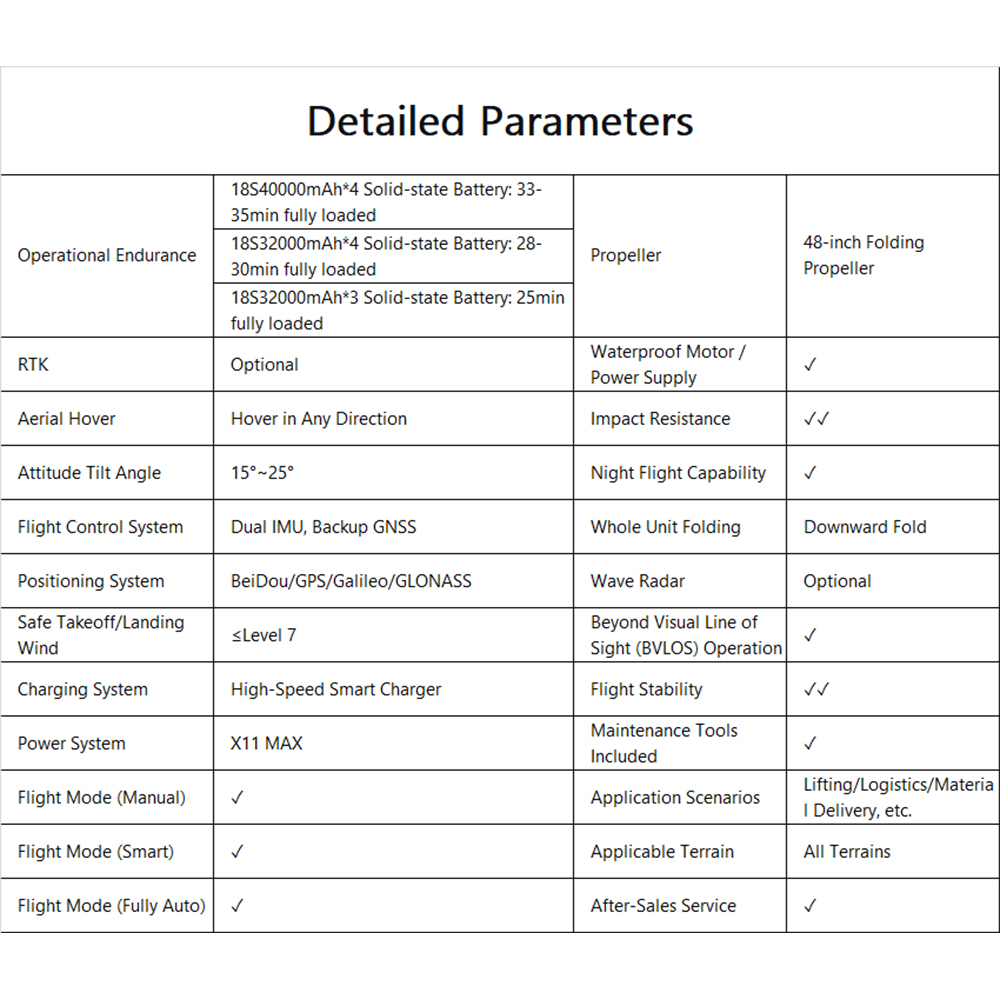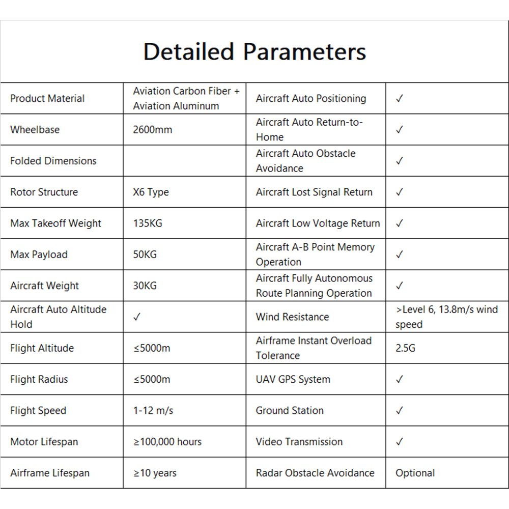 The SY2600 is a high-performance heavy-lift UAV engineered for demanding logistics and material delivery missions. It operates with full autonomy and intelligent route planning, enabling precise and reliable aerial transportation both day and night. Built for exceptional durability, the aircraft features 50-layer thickened carbon fiber arms and delivers superior impact resistance, supporting a substantial 50kg payload and a 135kg maximum takeoff weight. Its practical downward-folding design ensures compact and convenient transport. The UAV is fully waterproof and powered by a robust redundant propulsion system that ensures ample power reserves and flight safety. Equipped with a 1080P high-definition gimbal for stable imaging and a 5.5-inch high-brightness remote controller for intuitive operation, the SY2600 also features a fully modular design that simplifies maintenance and adaptation for various mission profiles, making it a versatile solution for lifting, logistics, and delivery across all terrains.